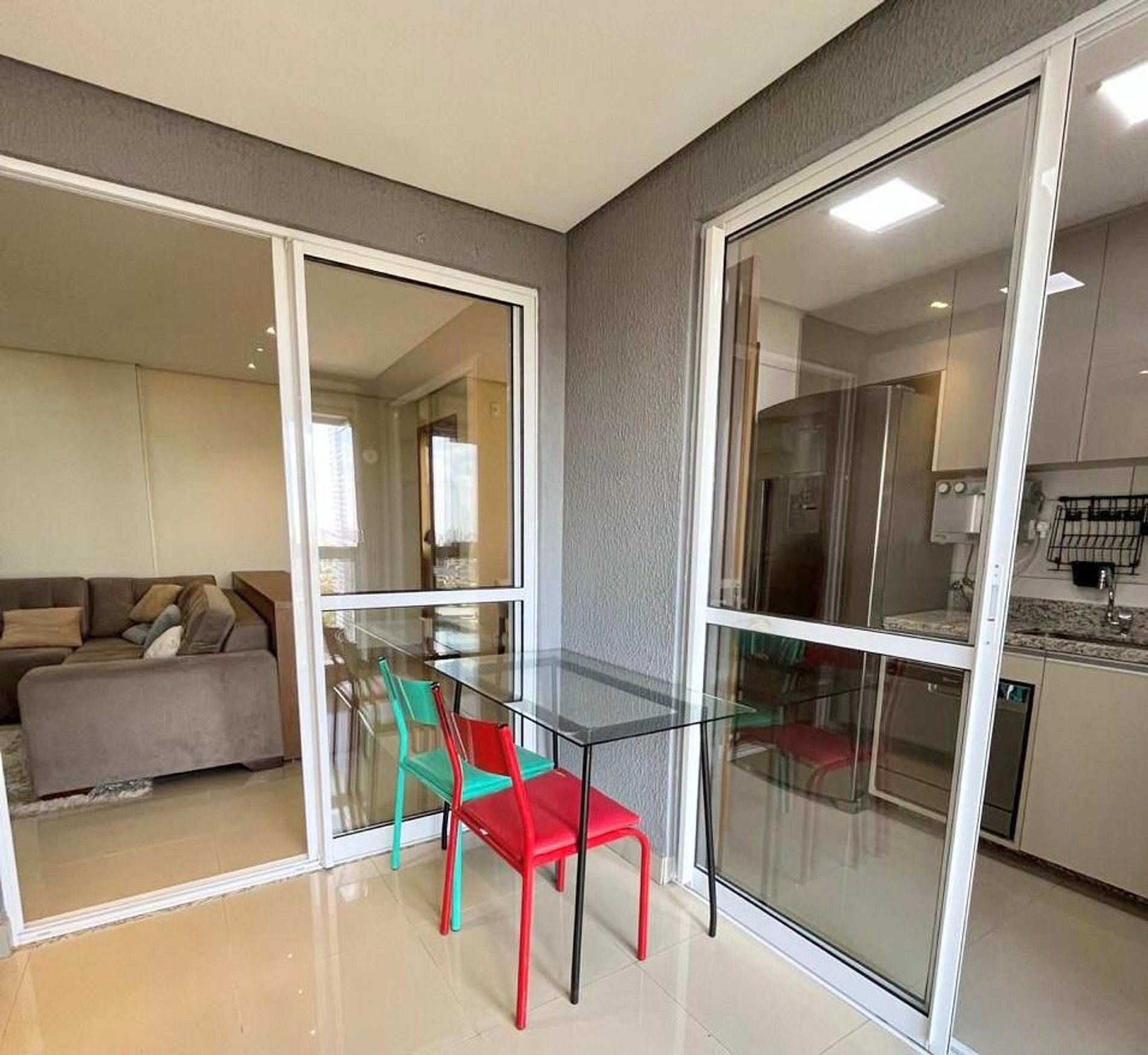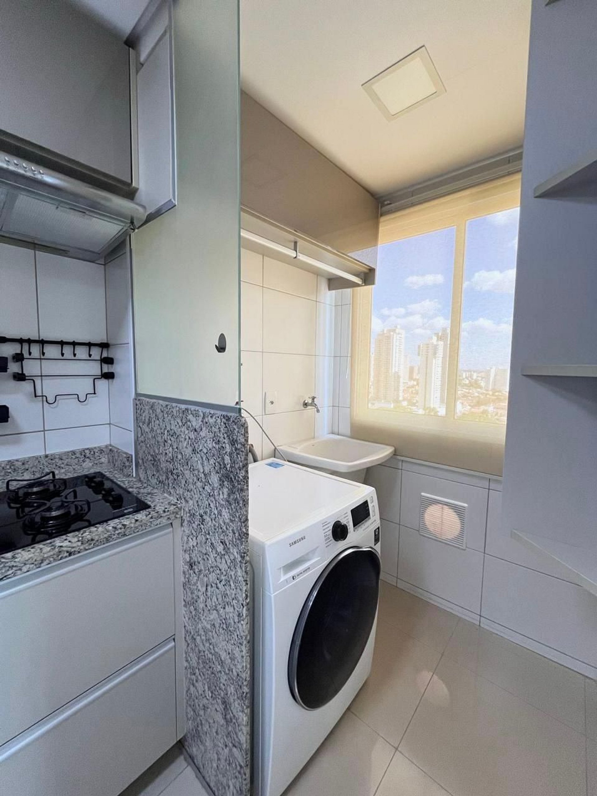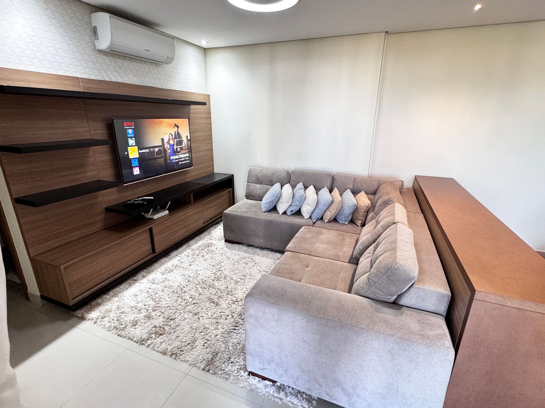 Sala de estar com TV smart, cozinha equipada, lavanderia e sacada.