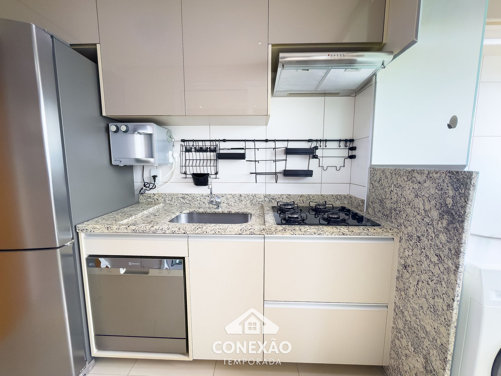A unidade oferece sala de estar ampla, varanda com vista livre e deslumbrante, além de ar-condicionado nos quartos e na sala. A cozinha é completa e equipada com eletrodomésticos e utensílios, incluindo fogão elétrico, forno, geladeira, micro-ondas, lava louças, máquina de lavar e filtro de água.