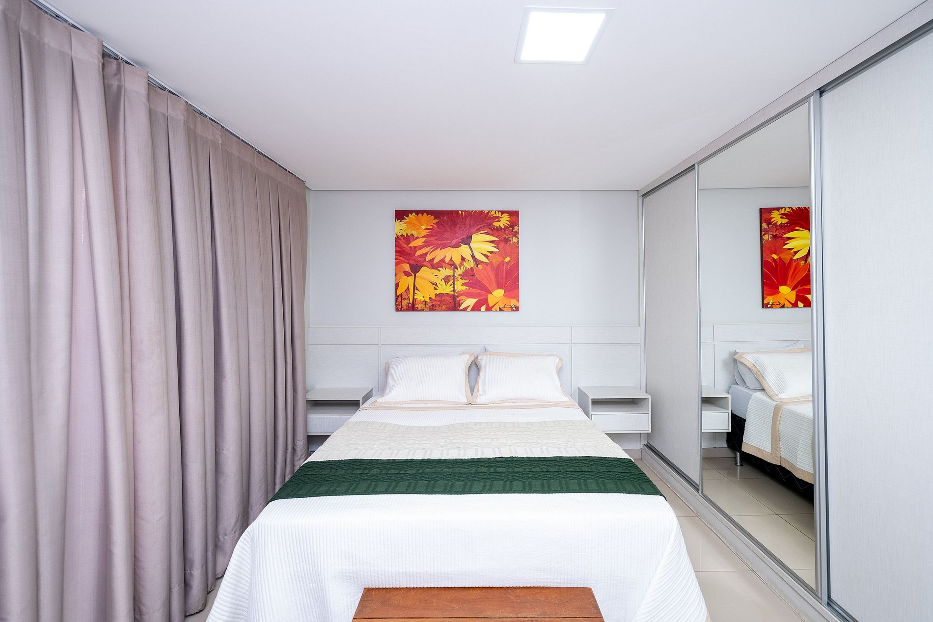 - Cama Queen, TV Smart, armários, ar condicionado