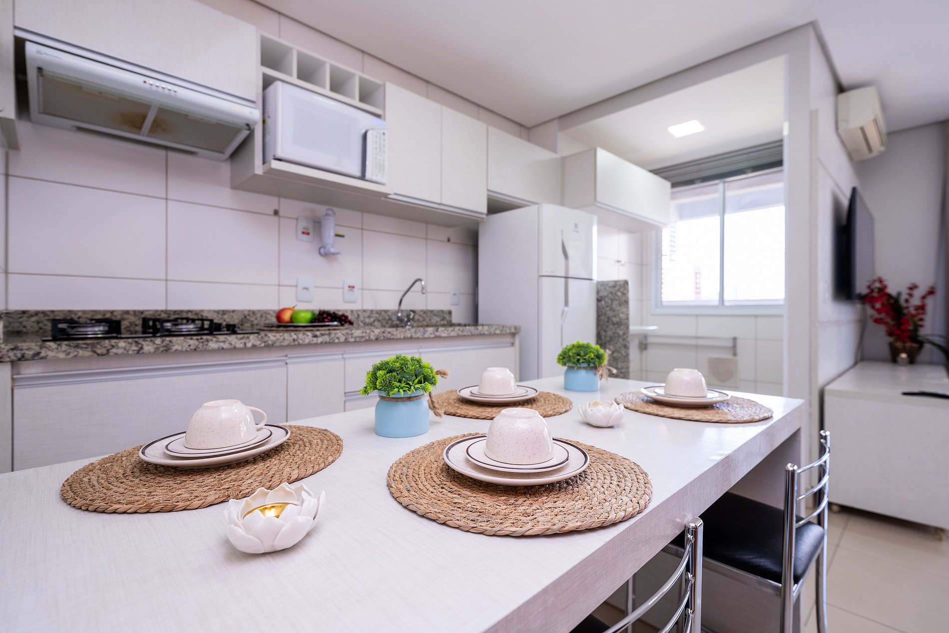 Possui os itens básicos (Cooktop, micro-ondas, panelas, talheres, geladeira, roupa de cama, amenities, toalhas, etc..)