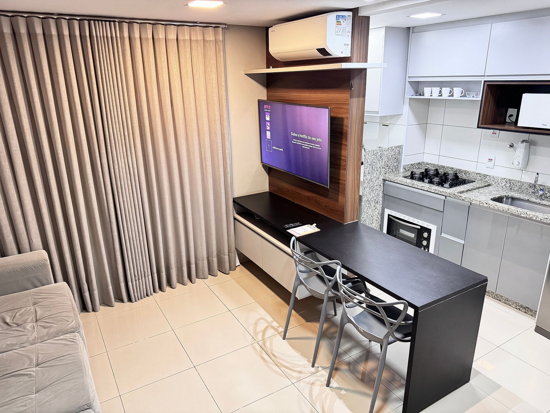 - TV Smart na sala e quarto, cortina blackout;