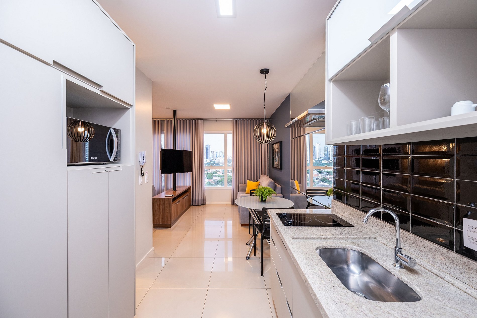 Apartamento possui cozinha equipada (micro-ondas, cooktop, panelas, talheres, geladeira)
