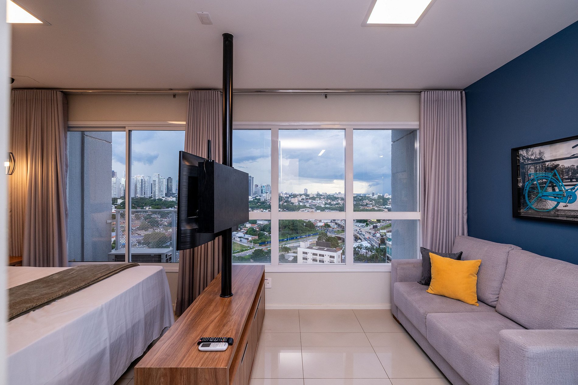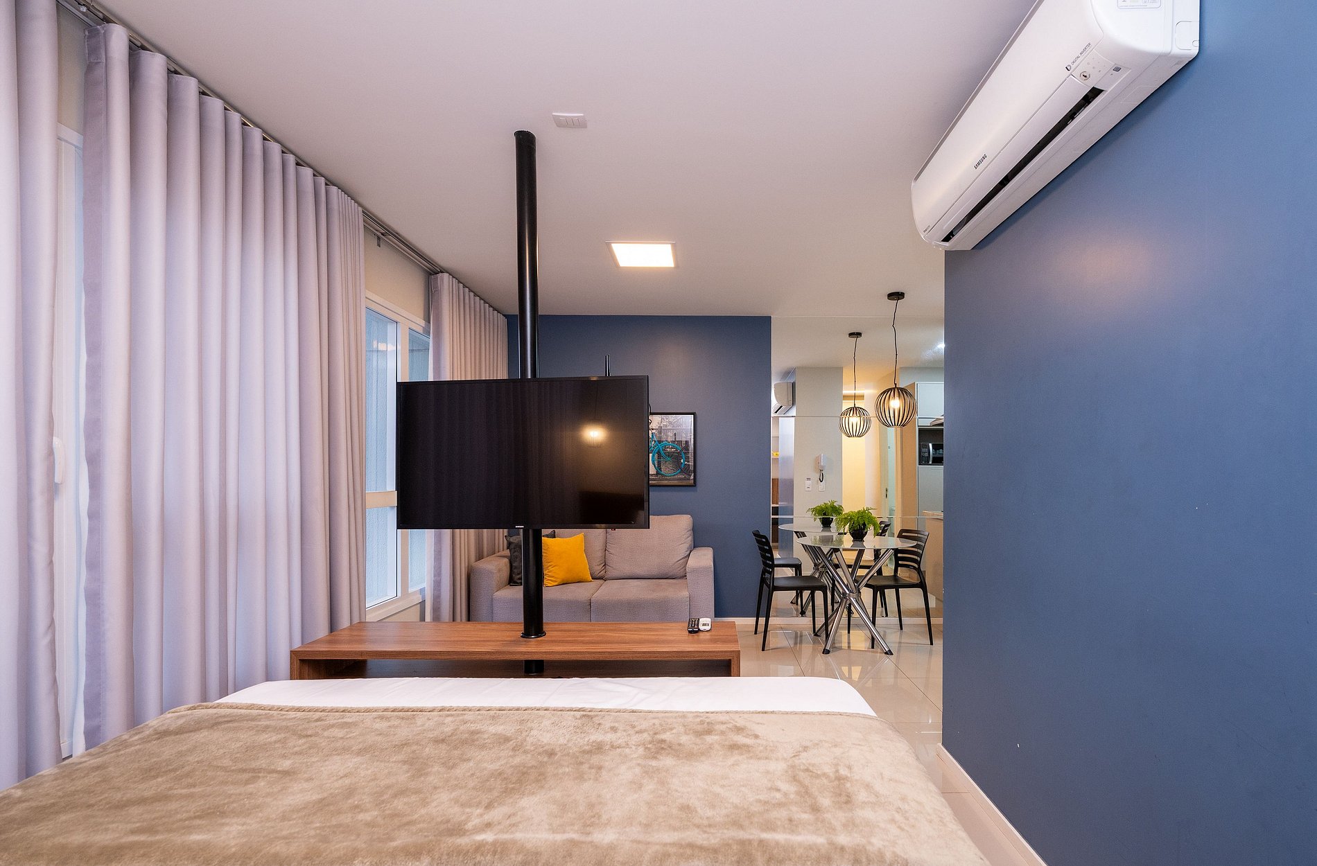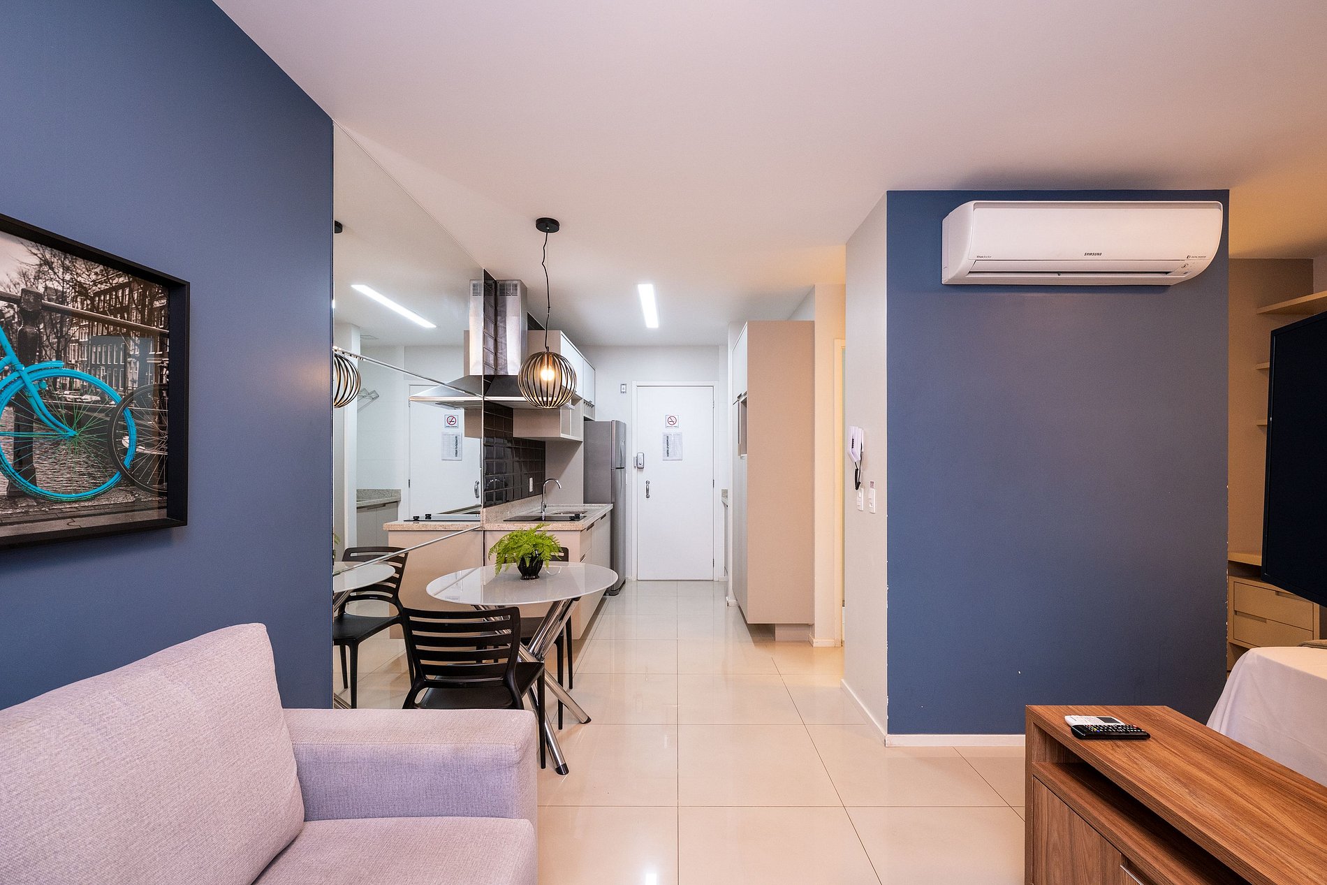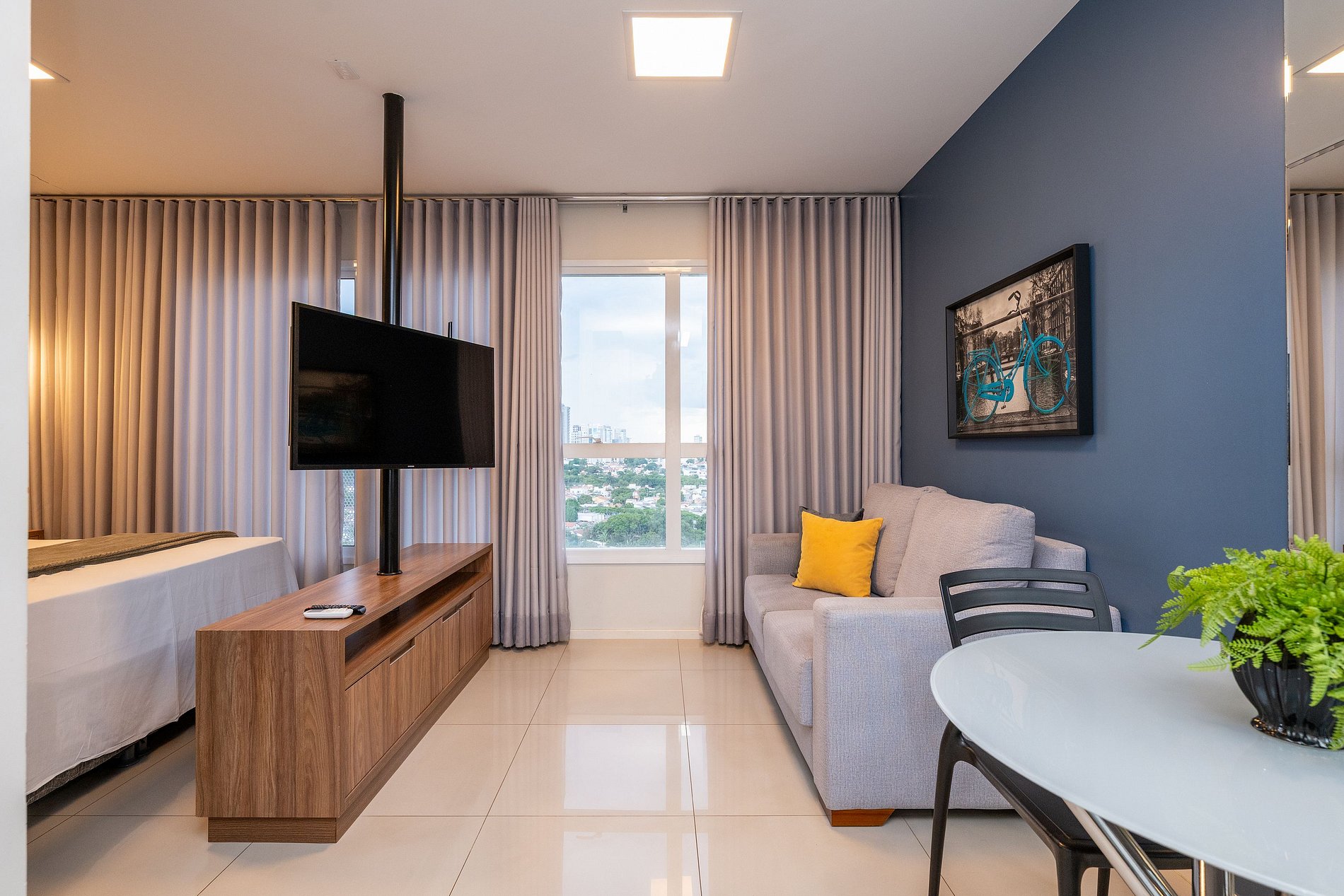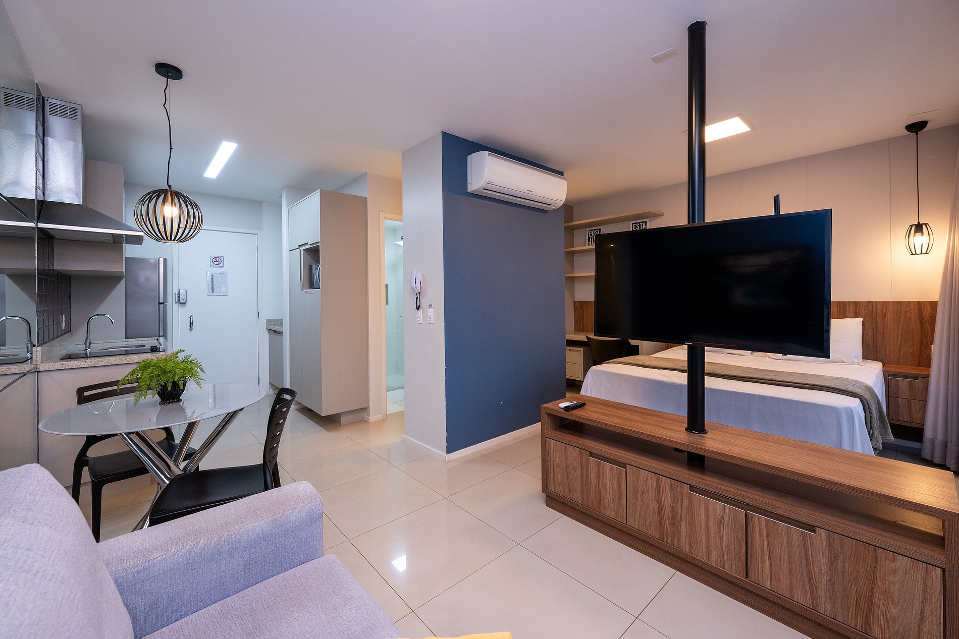 - Sala de estar com sofá e TV Smart;
