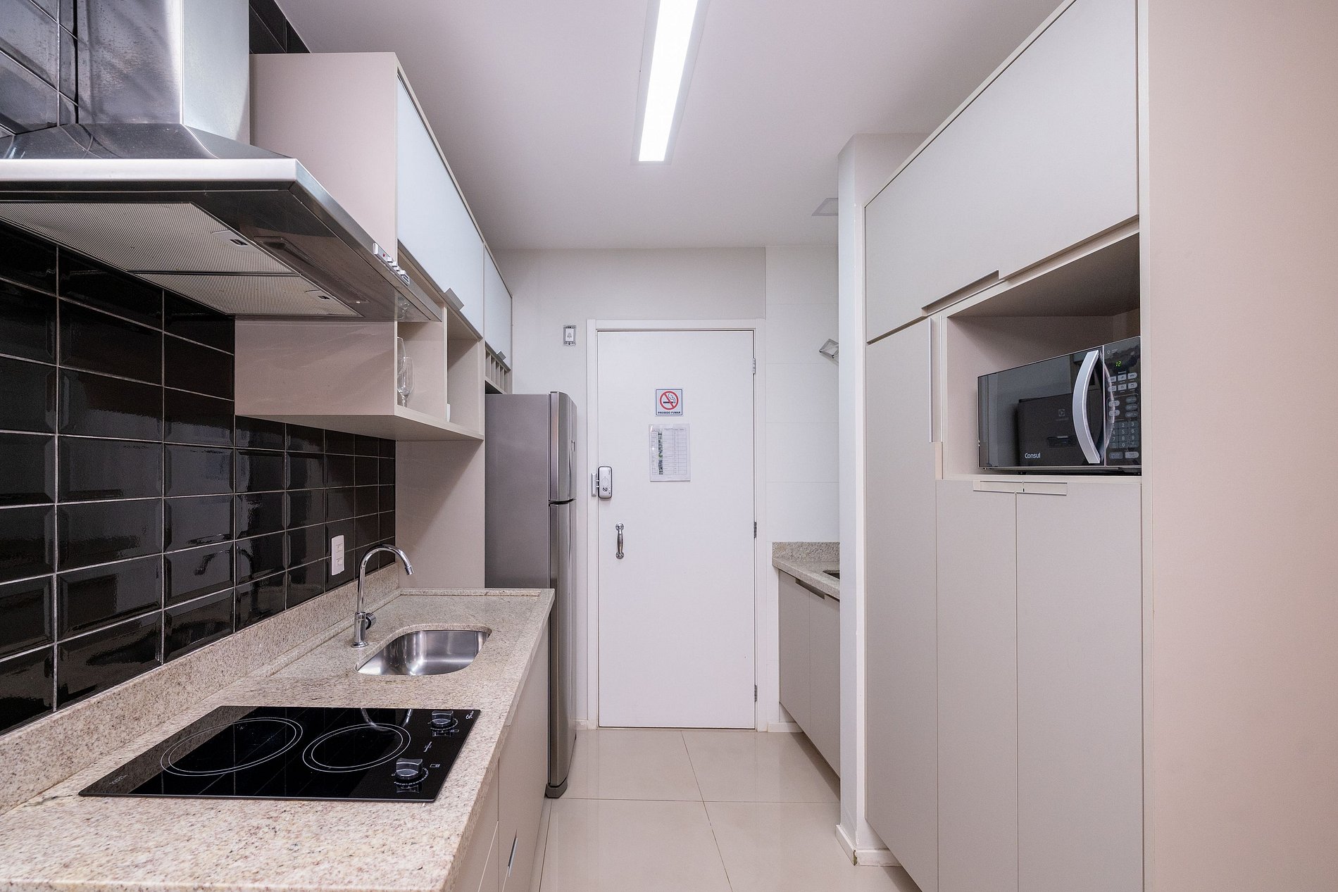Apartamento possui cozinha equipada (micro-ondas, cooktop, panelas, talheres, geladeira)