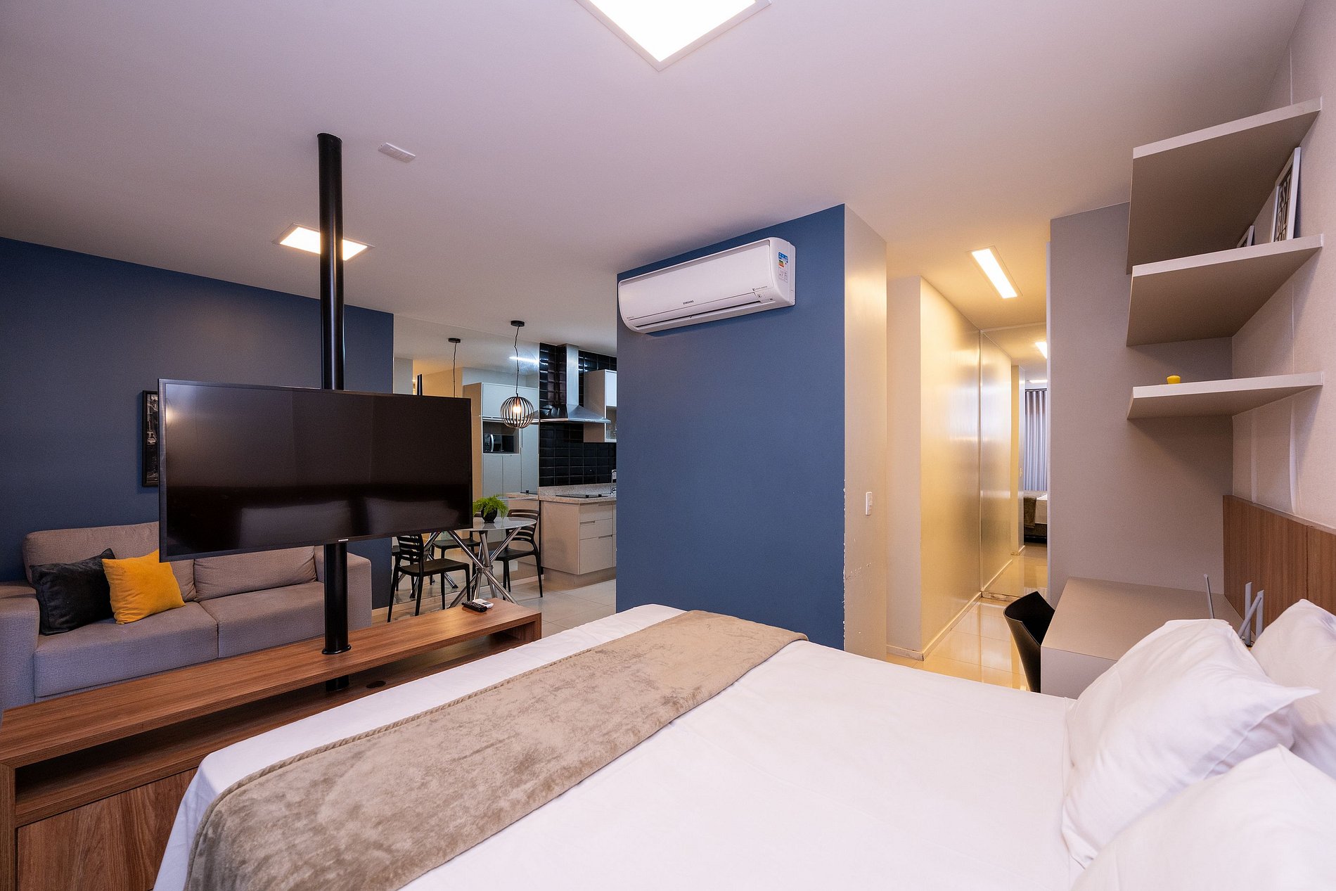 - Sala de estar com sofá e TV Smart;