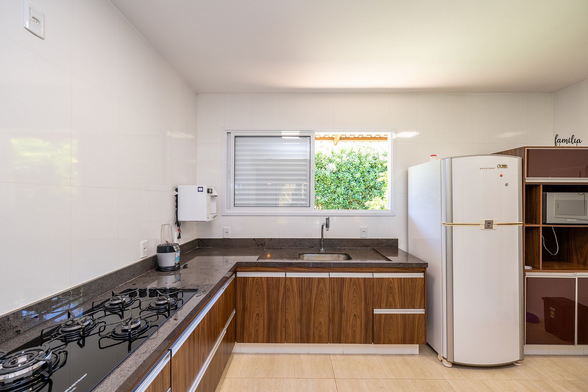 - Cozinha completa com geladeira, fogão, forno elétrico, micro-ondas, sanduicheira, chaleira elétrica, liquidificador, taças de vinho/ champagne, panelas, louças e utensílios;