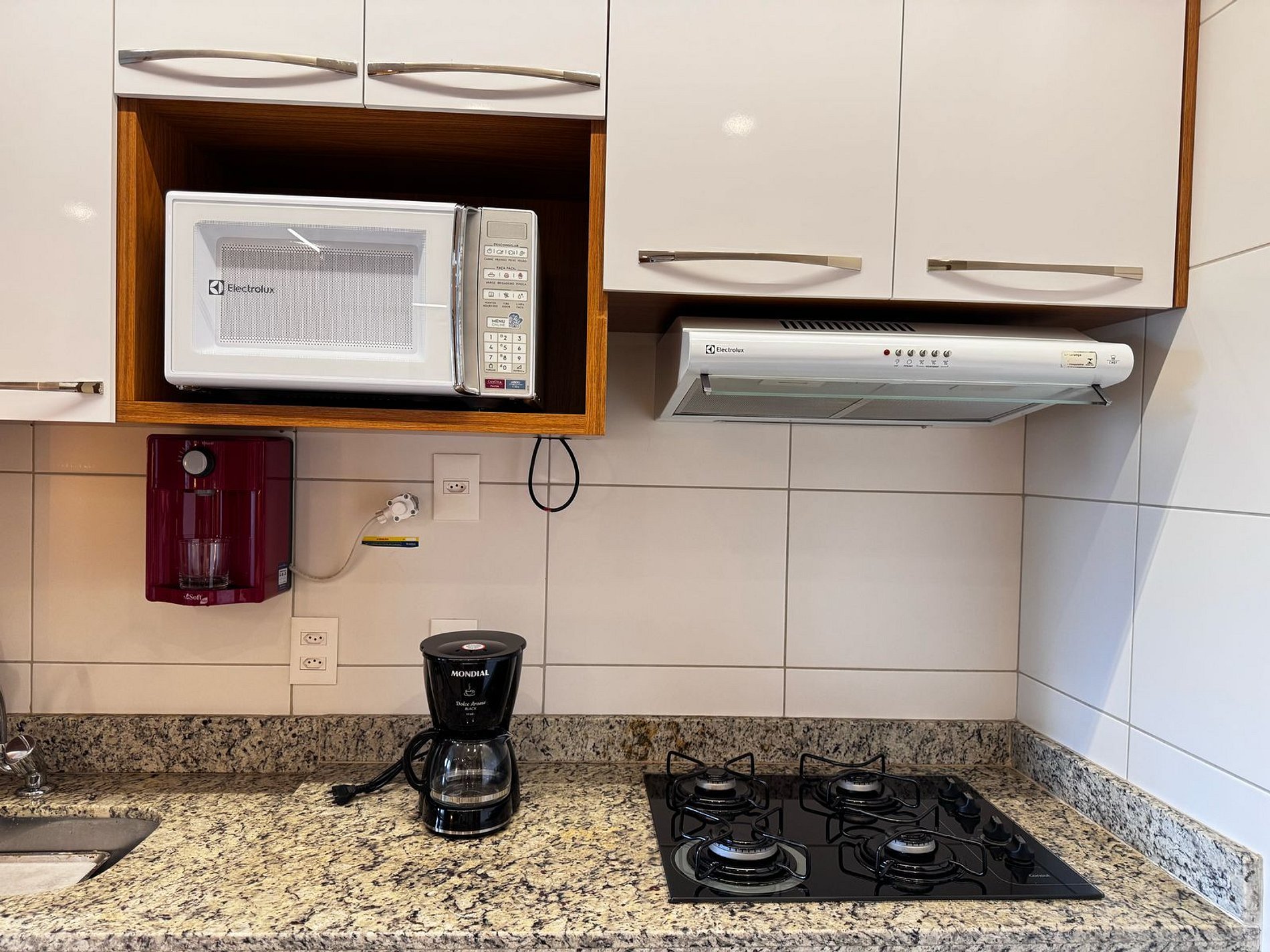 Possui os itens básicos (microondas, forno, panelas, talheres, geladeira, roupa de cama, amenities, toalhas, etc ) Mini Mercado / Conveniência no Mezanino do prédio.